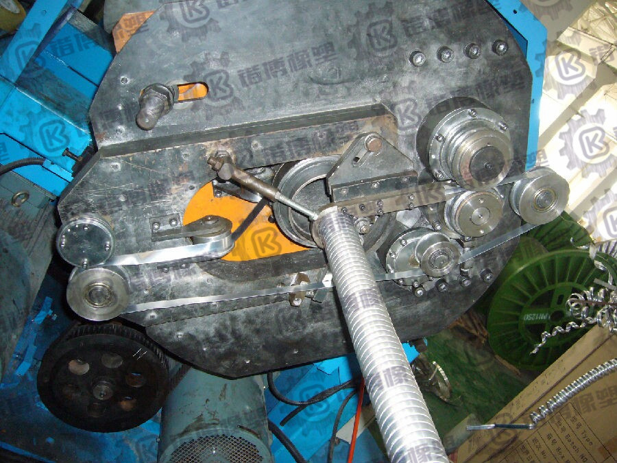 4.2.5?主機的中心裝有兩根不銹鋼中心管一根與主軸連接在一起,起到輸送鋁帶作用。另一根內中心管固定不轉,為避免電纜線在鎧裝過程中擦傷,設備在進線端裝有聚四氟材料的定位模塊,用于保護和固定電纜線。